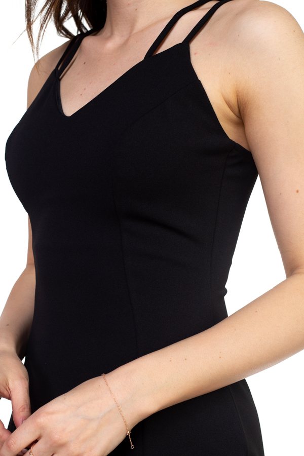 A knit dress, solid color, a v-neckline, double spaghetti straps, front princess seams, a crisscross back, a bodycon silhouette, and a mini length