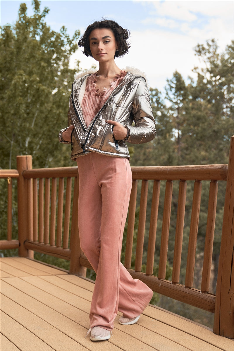 solid, long sleeve with elastic hem, classic hood lined with fuzzy faux fur for extra warm, padded design, front fastening and snap button, front zip fastening pockets, black contrast zippers, lined with faux fur, short length, non-stretch, cute look, disco, retro, eye-catching, trendy design, activewear, snowboard and skiing outfit, perfect winter jacket!