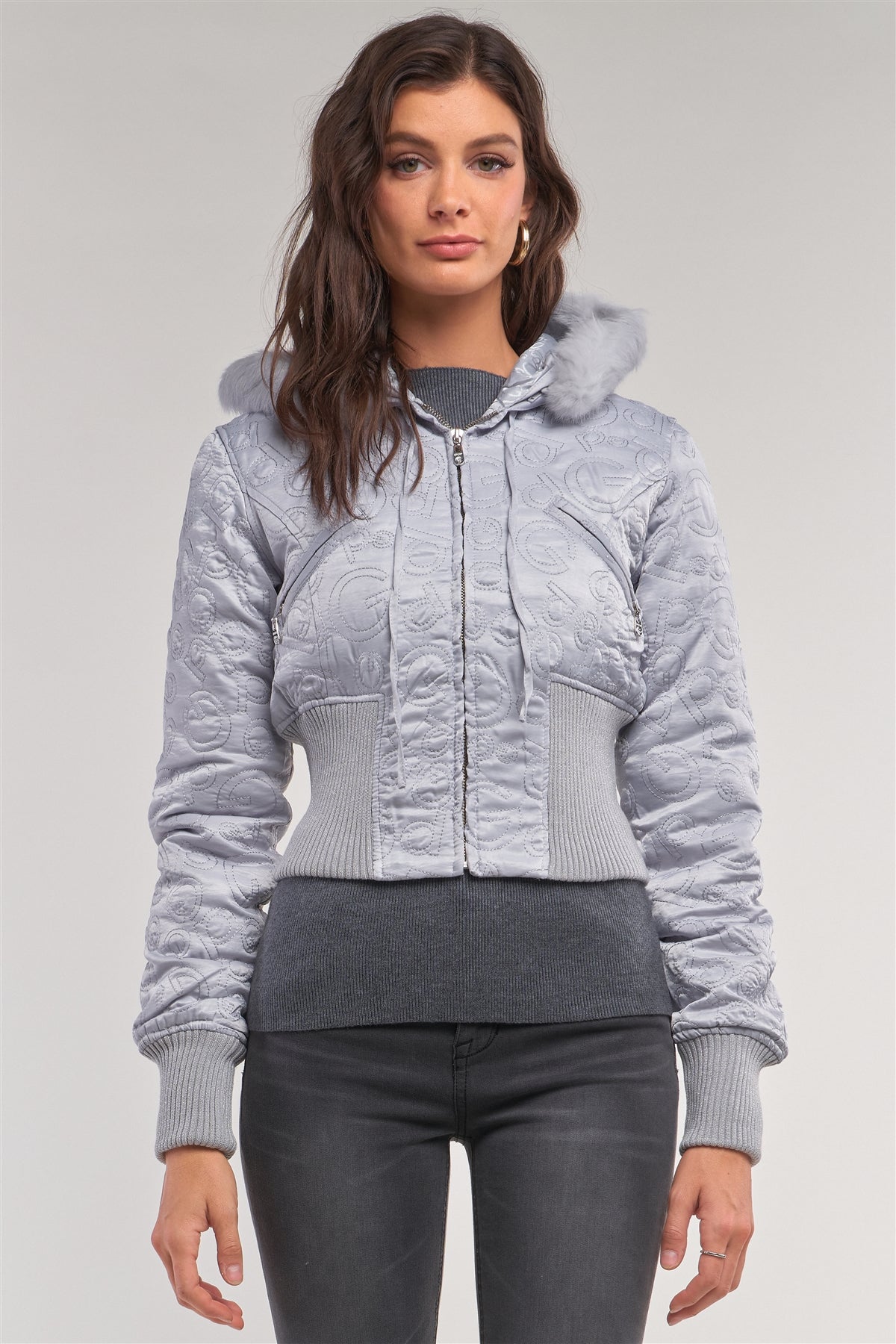 Letter Printed Zip-up Faux Fur Hood Detail Cropped Winter Bomber Jacket